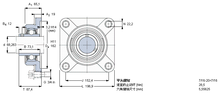 SKF轴承 > 法兰型Y轴承单元,铸造轴承座,方形法兰,平头螺钉锁定,可用于空气调节系统 > FYMF2.11/16TF/AH
