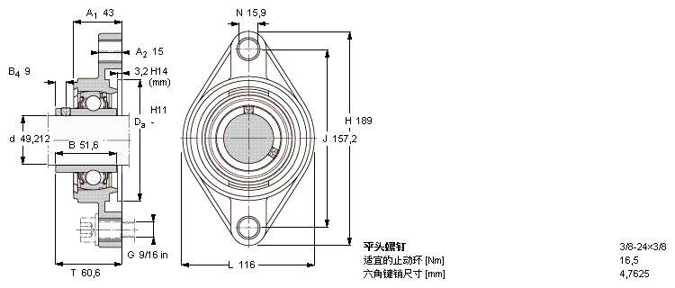 SKF轴承 > 法兰型Y轴承单元,铸造轴承座,椭圆法兰,平头螺钉锁定,可用于空气处理系统 > FYT1.15/16TF/AH